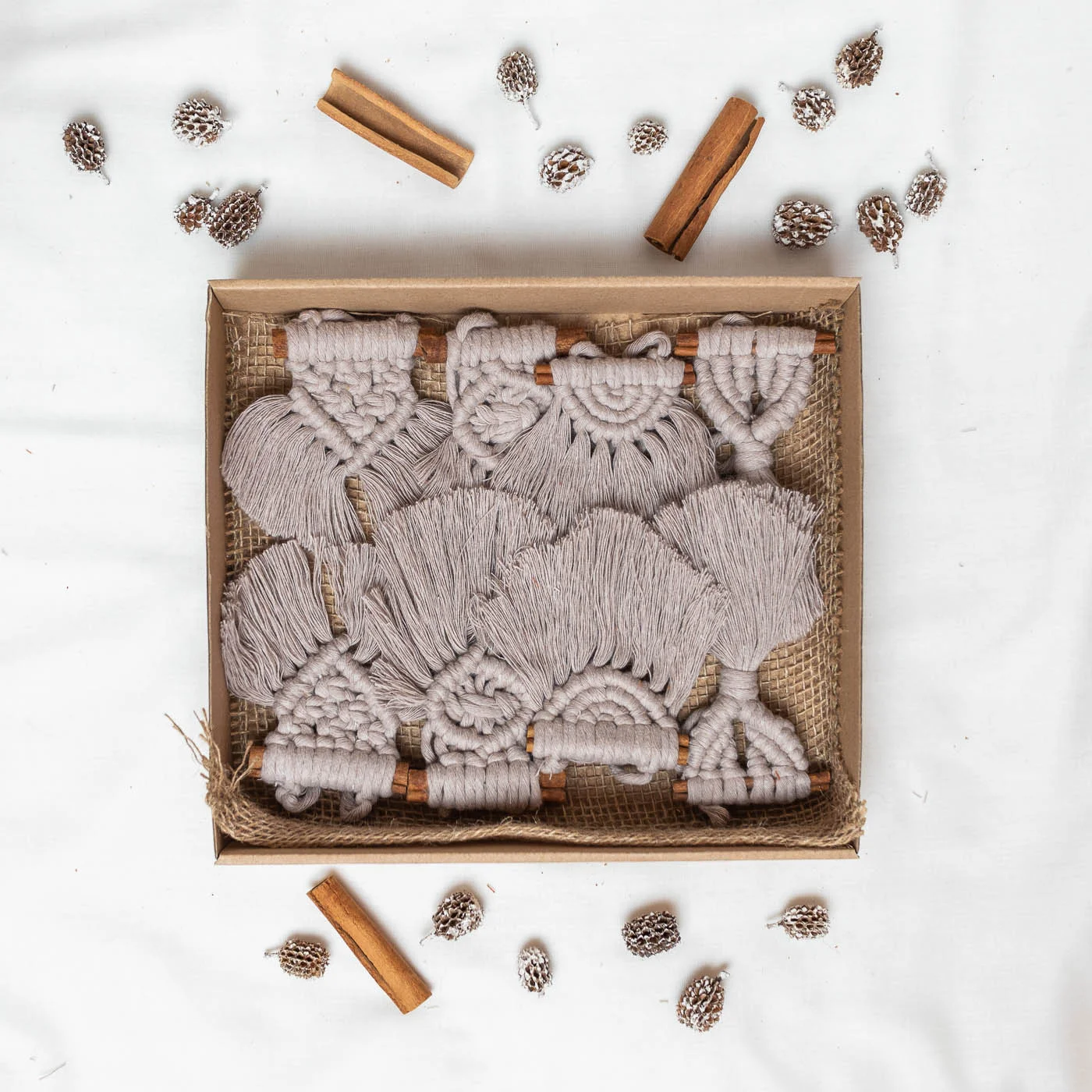 Makramé csomózási technikával készült karácsonyfadíszek 8 db-os kiszerelésben (1 féle színben és 4 mintában) rendelhetők, melyek prémium minőségű újrahasznosított pamutból előállított sodrott fonalból készültek és fahéjrudakhoz vannak rögzítve.
