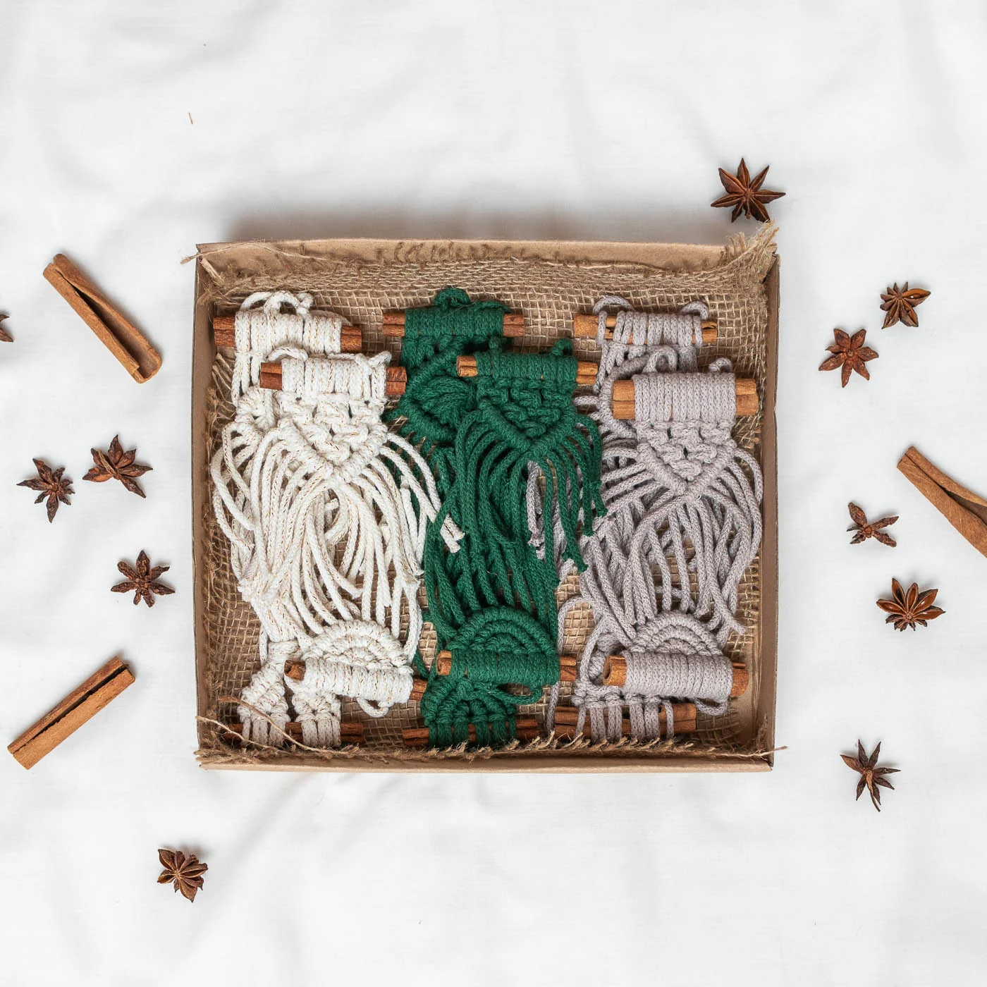 Makramé csomózási technikával készült karácsonyfadíszek 12 db-os kiszerelésben (3 féle színben és 4 mintában) rendelhetők, melyek prémium minőségű újrahasznosított pamutból előállított zsinórfonalból készültek és fahéjrudakhoz vannak rögzítve.