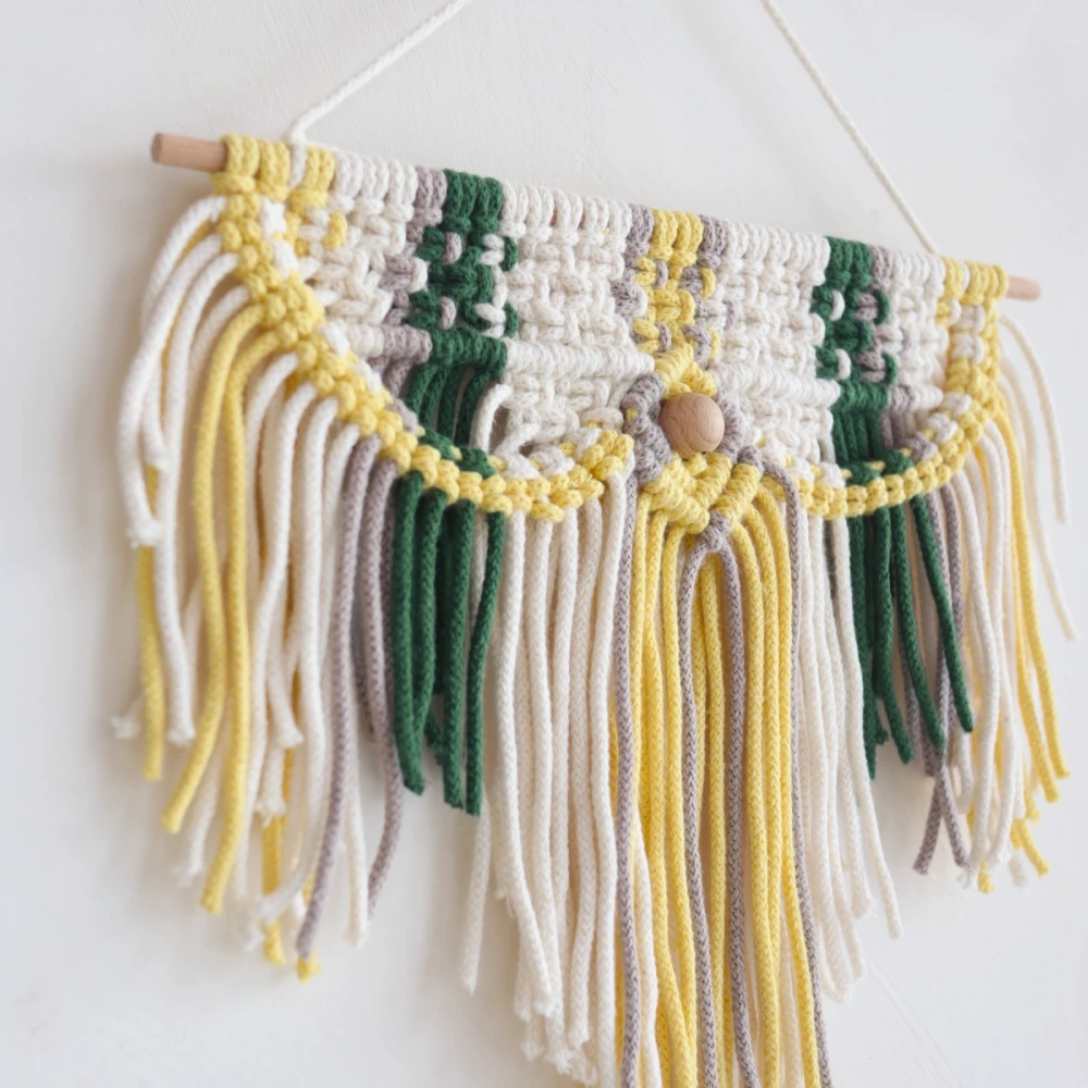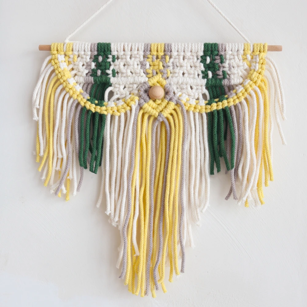 A még megmaradt ekrü, hamvas barna és igen kevés zöld fonal felhasználásával készült, amihez pluszban kibontottam a citromsárga gombolyagomat, amiből végül egy igen extrém, vidám falidísz született. Készítése és fotózása közben nem mint ki a fejemből a jamaicai életérzés reggae zenék fűszerezésével, vagy éppen a riói karnevál szamba táncosaival, de még ide sorolható a brazil foci őrület is. Lényegében ez a falidísz bármikor elrepít melegebb éghaljlatra (még engem is úgy, hogy hóesésben készítettem). Szóval ezt a nem mindennapi, élettel teli és vibráló makramét egy kis játékossággal Rio de Yarneilonak neveztem el. Nézd meg kistestvérét is!
