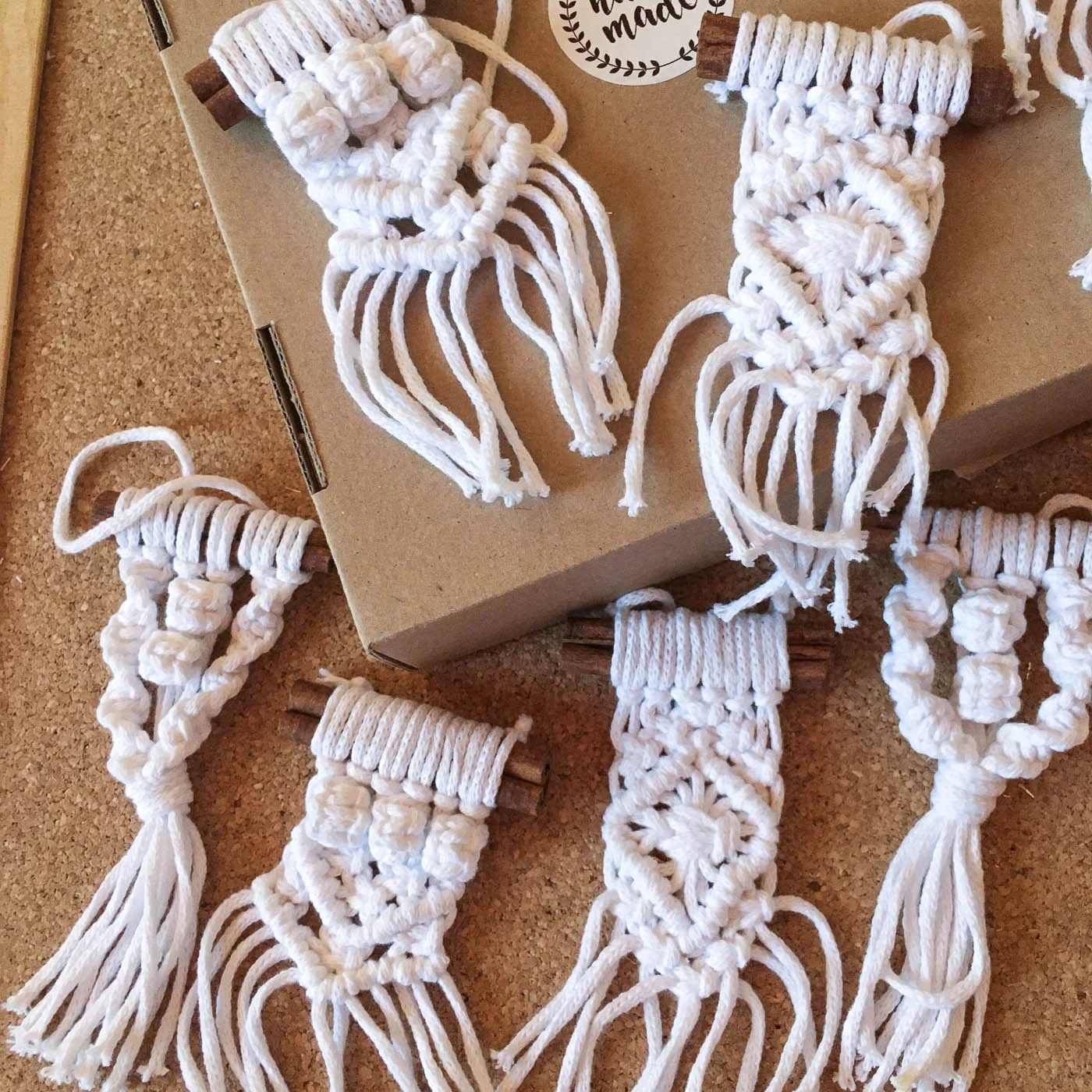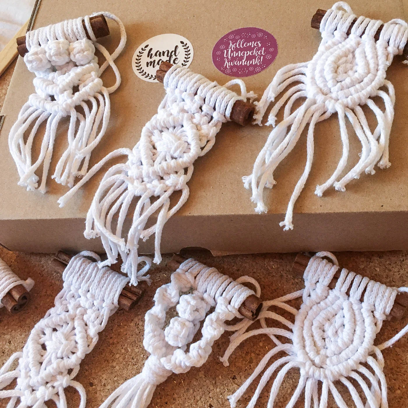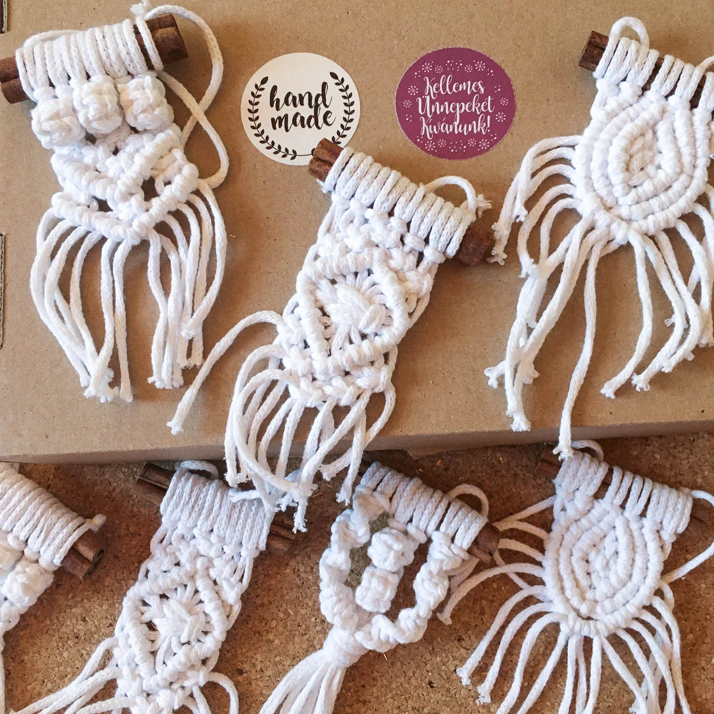 Makramé csomózási technikával készült karácsonyfadíszek 8 db-os kiszerelésben (1 féle színben és 4 mintában) rendelhetők, melyek pamutból előállított zsinórfonalból készültek és fahéjrudakhoz vannak rögzítve.