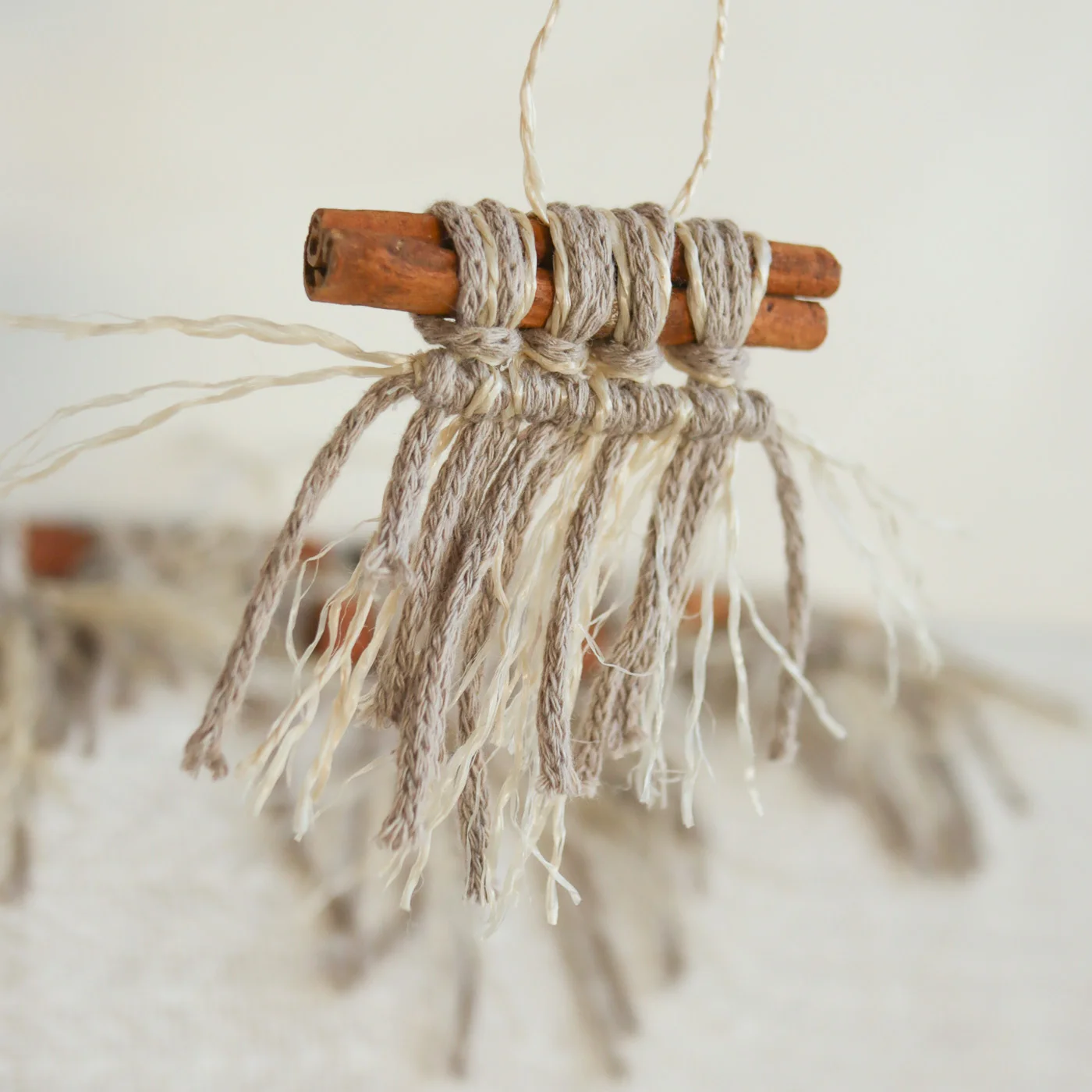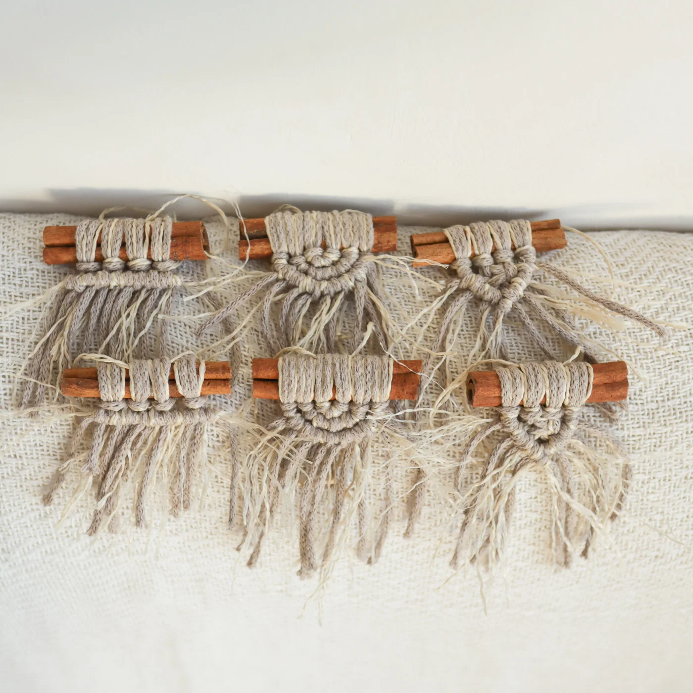 Makramé csomózási technikával készült karácsonyfadíszek 6 db-os kiszerelésben (1 féle színben és 3 mintában) rendelhetők, melyek pamut zsinórfonalból és poliészter szizál kötözőből készültek, melyek fahéjrudakhoz vannak rögzítve.