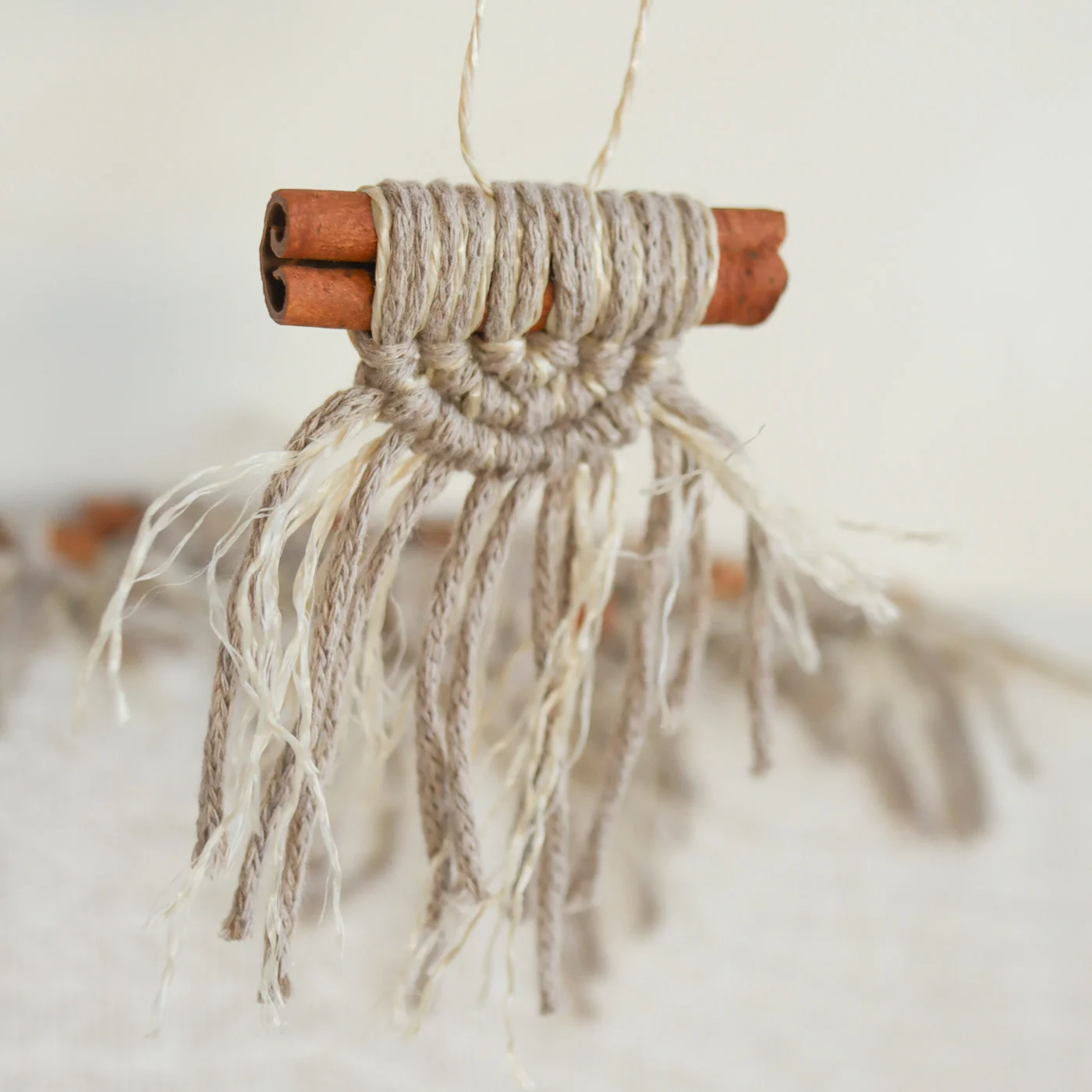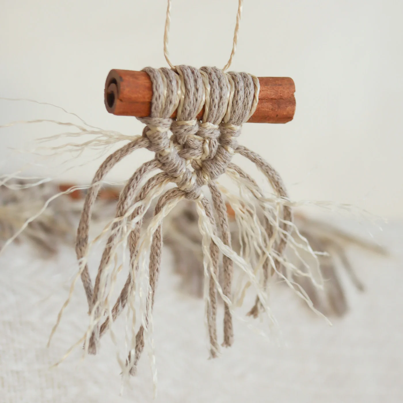 Egy nem megszokott fahéj rudas makramé karácsonyfadísz szett, ami pont belesimul a falusias, folk vagy wasi sabi stílusú lakberendezésbe. Ez a 6 db aprócska karakteres dísz garantáltan feldobja karácsonyfád, ami remekül mutat fából, termésből, textilből, juta zsákból, szalmából, gipszből/keményítőből, mézeskalácsból készült és natúr színű gömbdíszek mellé.